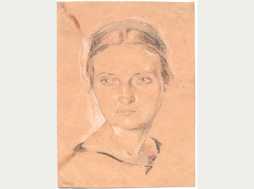 | Портрет Л. Покровской авторства Марии Мыслиной, художницы, занимавшейся иллюстрацией, оформлением плакатов, демонстраций и клубов. Жена художника Владимира Каабака, арестованного и расстрелянного в 1937 году, она была арестована как член семьи изменника родины и отправлена в Акмолинский лагерь жен изменников родины (АЛЖИР), позднее в женский лагерь в поселке Долинское, Карагандинская область. Этот портрет художницы-графика Лидии Покровской был написан во время заключения Марии в АЛЖИРе. Вместе с Лидией Ивановной, заключенной АЛЖИРа в 1938–1946 годах, Мария Владимировна оформляла в лагере самодельные спектакли. Слева внизу карандашом авторская дата: "10.7.43". На обороте надпись графитным карандашом: "Портрет Покровской Лидии Ивановны (художник-декоратор) рисунок художницы Марии Мыслиной лагерь "Алжир" 1940 г." | |
