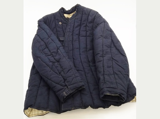 | Ватные стеганые куртки (телогрейки) подобные этой долгое время были повседневной одеждой в Советском Союзе. Их носили как военные, так и гражданское население, те, кто сидел в лагерях и тюрьмах, и те, кто там никогда не был. Эта телогрейка из семьи Бориса Алексеевича Константинова, простого советского гражданина, дед и два брата отца которого были священниками, оба дяди были репрессированы. Борис родился в Дмитрове 29 октября 1926 года и помнил Дмитлаг и строительство канала. В холодное время года заключенные носили такие стеганые куртки на вате. В Музей Международного Мемориала телогрейку передала жена Бориса Алексеевича. Она не помнит точно, принадлежала она мужу-подростку или его отцу, но телогрейка "прожила" в семье все военные годы и еще много послевоенных лет. Ее почти не использовали после переезда в Москву в 1941 году, но Борис Алексеевич хранил ее как память о детстве. | |